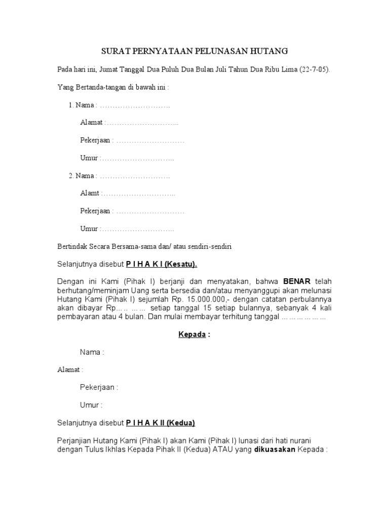 Hal ini dikarenakan ada beberapa format yang harus dipenuhi. Contoh surat pernyataan pelunasan hutang kepada bank surat pernyataan pelunasan hutang saya yang bertanda tangan di bawah ini : Contoh surat pernyataan kali ini adalah sebuah format surat pernyataan yang menyatakan kesanggupan membayar hutang oleh pihak peminjam kepa. Contoh surat pernyataan hutang yang benar. Baik secara formal maupun non formal surat ini berisi mengenai kesanggupan, mulai dari kesanggupan bekerja,membayar denda, bertanggung jawab, dan.